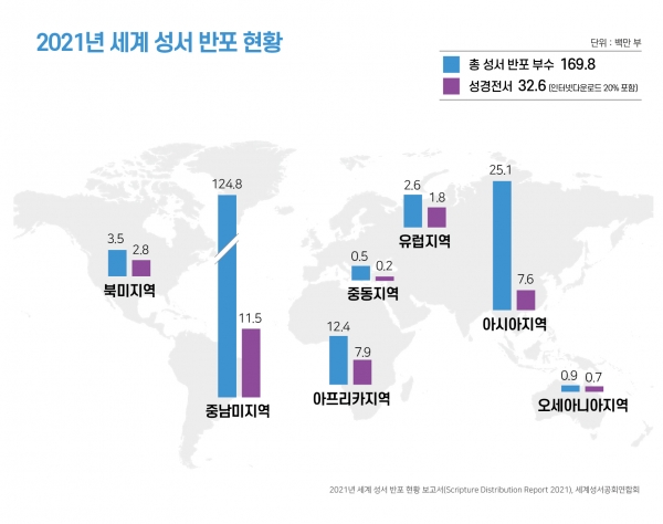 세계성서공회연합회가 발표한 '2021년 세계 성서 반포 현황 보고서'에 따르면 지난해 전 세계에 3천260만 부가 넘는 성경전서가 반포됐고, 신약성서 등 부분 성경까지 합하면 총 1억6천980만 부의 성서가 보급됐다고 대한성서공회(이하 공회)가 7일 밝혔다.