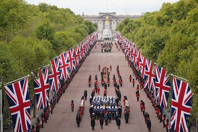 여왕의 관은 장례 행렬과 함께 웨스트민스터 채플을 떠나 웰링턴 아치까지 약 2km를 행진하며 길가의 시민 수백만 명과 인사했다. 기마대와 군악대가 앞장섰고, 찰스 3세 국왕과 왕실 인사들이 걸어서 뒤따랐다.