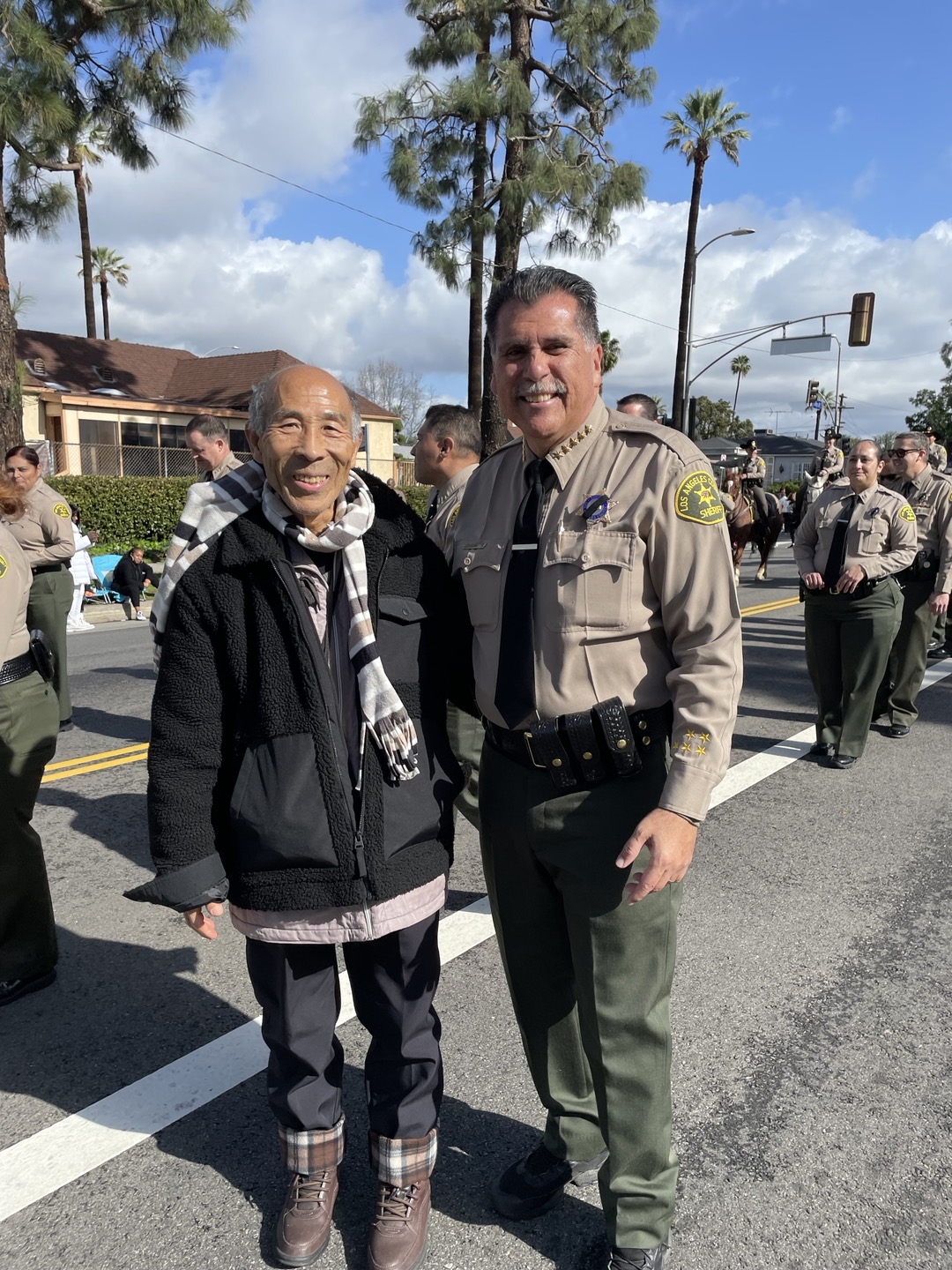 마틴루터킹데이를 기념한 퍼레이드에 참석힌 세리프 국장 로버트루나와 인사를 나누고 있다.