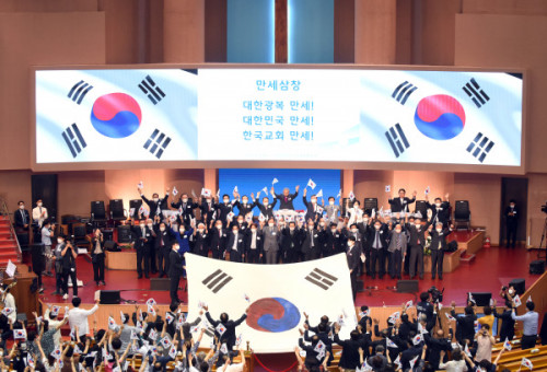 ▲ 한교총이 광복 77주년 한국교회 기념예배를 가졌다.  한국교회총연합 제공한국교회총연합(대표회장 류영모, 이하-한교총)이 지난 10일 여의도순복음교회에서 8.15 광복 77주년을 기념하며 ‘광복 77주년 한국교회 기념예배’를 가졌다.이날 본 연합 소속 28개 교단 임원과 교인들이 참석했으며, 성명서 낭독 후 대형 태극기를 들어 올린 채 애국가를 제창하며 다시 한번 한국교회의 위대한 꿈을 그리는 역사적인 순간이 있었다. 공동대표회장 이상문 목사(예성 직전총회장)의 인도로 드려진 기념 예배에서는 김주헌 목사(기성 총회장)의 대표기도와 김명희 목사(예장보수개혁 총회장)의 성경봉독, 베데스다 찬양대의 특별찬양에 이어 대표회장 류영모 목사(예장통합 총회장)가 ‘야드바셈: 꿈엔들 잊을건가’라는 제하의 메시지를 선포했다.류 대표회장은 “36년간 선조들이 겪었던 고난을 뒤돌아보며, 이 힘없는 백성을 하나님이 사랑하셔서 해방의 기쁨을 주신 것에 대해 역사의 주인은 하나님이시라는 사실을 늘 잊지 말아야 한다”면서 “1945년 8월 15일 맞이한 민족의 해방은 정치적 해방을 뛰어넘는 인간 자체의 해방이고, 종교의 자유를 찾은 하나님의 승리, 한국 기독교회의 승리이다”고 말했다.아울러 그는 “민족의 혼을 깨우고 독립운동의 본거지가 된 사학의 건학 정신을 지키지 못하고, 기독교의 가치를 망각한 것을 회개하며 지켜내야 한다”면서 “한국교회가 하나 되어 눈물로 교회를 지키고, 다음세대와 사회적 약자를 향해 희망의 등불이 되어 달라”고 전했다.설교 후 회원교단 총회장과 총무들이 등단하여 한국교회가 나라와 민족을 위해 기도하는 특별기도시간을 가졌다.교인들은 광복에 대한 감사, 나라를 위하여, 남북의 평화와 사회 갈등의 해소, 한국교회의 연합 등을 골자로 통성기도했으며, 공동대표회장 강학근 목사(예장고신 총회장)와 김기남 목사(예장개혁 총회장)의 8.15 광복 77주년 한국교회 성명서 낭독이 이어졌다.한교총은 성명서를 통해 △일본 정부는 군국주의자들의 잘못을 반성하고, 미래지향적으로 평화로운 관계 정립에 나서기를 촉구한다 △비방과 분열의 정치는 선열과 다음세대에 대한 범죄행위다. 즉시 분쟁을 멈추고 화합과 협력의 길을 모색할 것을 촉구한다 △한국교회는 대한민국의 자유와 민주와 평화를 위해 헌신하며, 다음 세대가 살아갈 대한민국의 안정된 발전과 새로운 부흥을 꿈꾸며 세계평화를 선도하는 나라가 되도록 노력할 것이라는 내용을 낭독했다.곧이어 참석한 모든 이들이 일어나 이철 감독(기감 감독회장)의 선창으로 만세삼창을 외쳤으며 애국가를 제창하였다. 끝으로 장종현 목사(예장백석 총회장)의 축도로 모든 순서를 마무리했다. (출처 한국교회신보 원문보기)